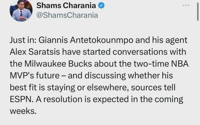 同樣來自爆料王Shams的消息源,倘若字母哥申請交易,涉及的球隊將遠(yuǎn)不止紐約尼克斯。薪資專家Marks對此表示,其余29支球隊都會跟雄鹿打電話詢價字母哥。