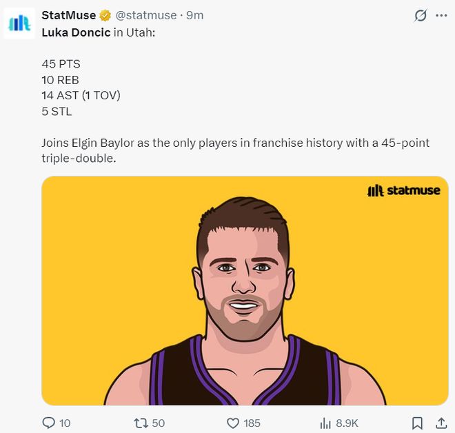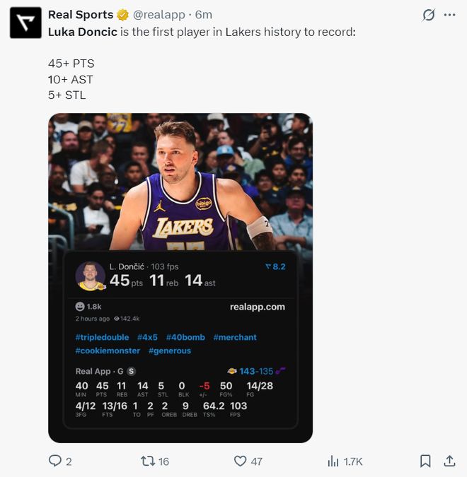 6.東契奇是湖人隊史首位45+三雙+5搶斷的球員;