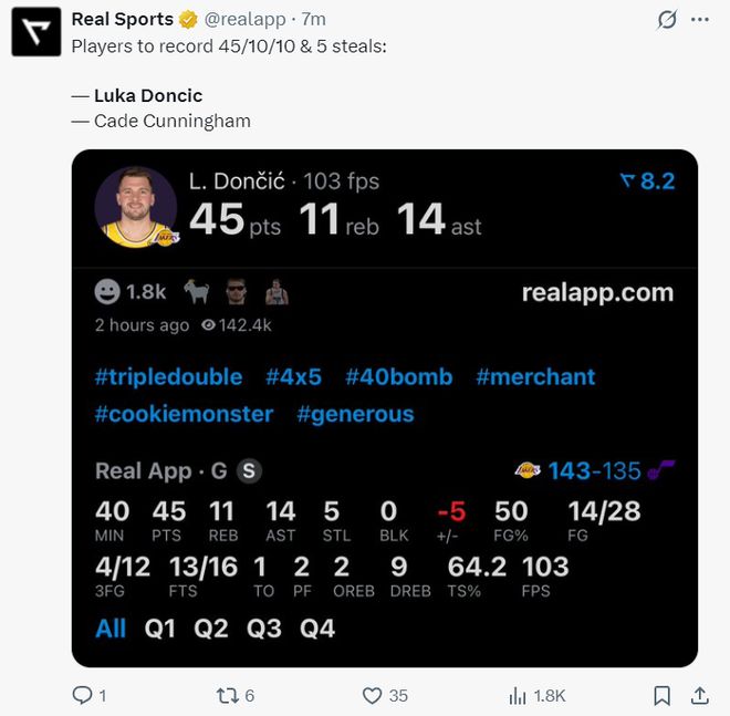 5.NBA歷史上拿到45+三雙+5搶斷的只有東契奇、坎寧安;