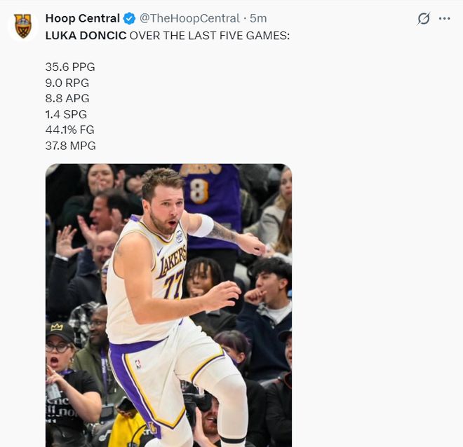 過去五場比賽東契奇場均35.6分9籃板8.8助攻1.4搶斷,命中率44.1%,他本賽季很有希望拿到聯(lián)盟的得分王。