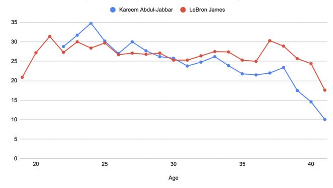對于NBA歷史上幾乎任何其他球員而言,能征戰(zhàn)至40歲以上便已是非凡成就,場均砍下17.6分更是前所未有的表現(xiàn)。此前,在41歲高齡仍能保有得分競爭力的傳奇球星是卡里姆-阿卜杜爾-賈巴爾,他在41歲賽季場均貢獻(xiàn)10.1分,而這已是其漫長職業(yè)生涯末期,狀態(tài)逐步下滑后的結(jié)果。賈巴爾生涯最后一個場均得分24+的賽季,定格在他33歲之時。