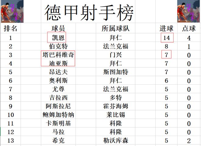 射手榜方面,前十沒有任何變化,凱恩14球高居榜首,伯克特8球位列第2。塔巴科維奇今天沒有進(jìn)球,還是和迪亞斯,昂達(dá)夫7球并列第3。吉拉西,西克,鮑姆加特納,尤尊等人5球剛好擠入前十。