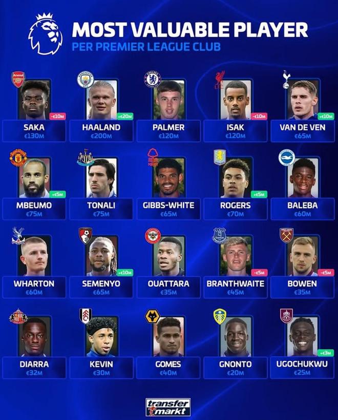 北京時間12月14日,在更新了英超球員的身價之后,德轉(zhuǎn)還統(tǒng)計出了英超20家俱樂部各自身價最高的球員,曼城的哈蘭德以2億歐元的身價領(lǐng)銜,利茲聯(lián)的尼奧托2000萬歐元最低。